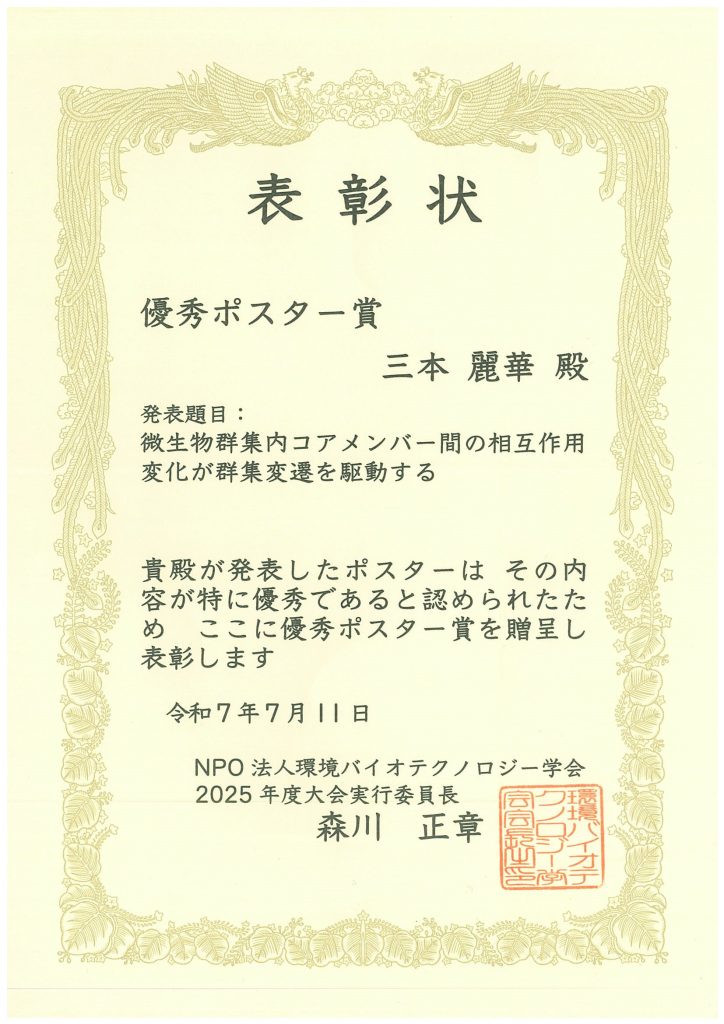 ・M2三本さんが、環境バイオテクノロジー学会2025年度札幌大会にて優秀ポスター賞を受賞!